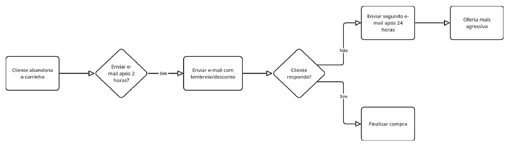 • Quando o cliente abandona o carrinho, um e-mail personalizado é enviado após 2 horas com um lembrete ou desconto especial.