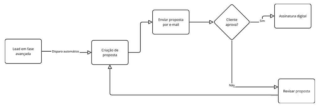 • Assim que o lead atinge uma fase avançada no funil, o CRM dispara automaticamente a criação de uma proposta personalizada.