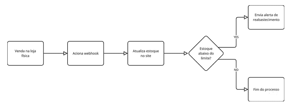 • Quando um produto é vendido na loja física, o sistema de POS aciona um webhook que atualiza o estoque automaticamente no site.